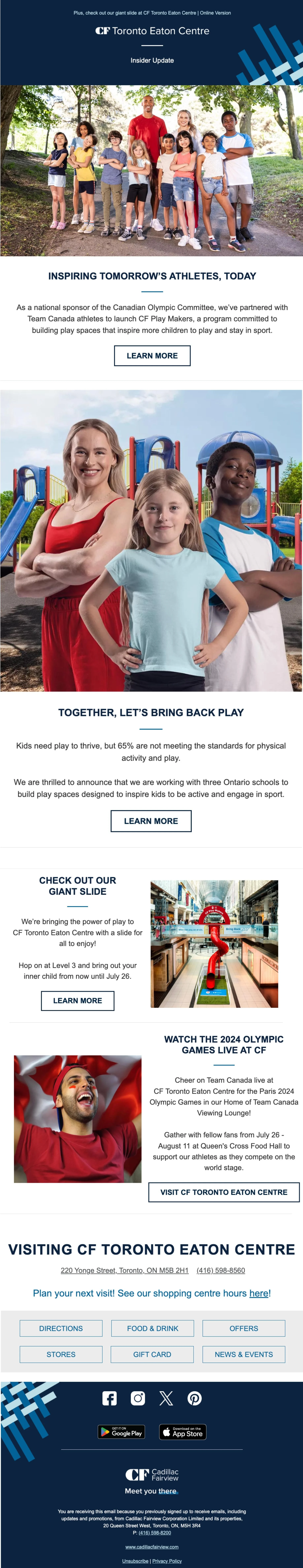 To inspire Canadian kids to increase their physical activity levels, Cadillac Fairview and the Canadian Olympic Committee invested in building and revitalizing play spaces across Ontario through their CF Play Makers Program.